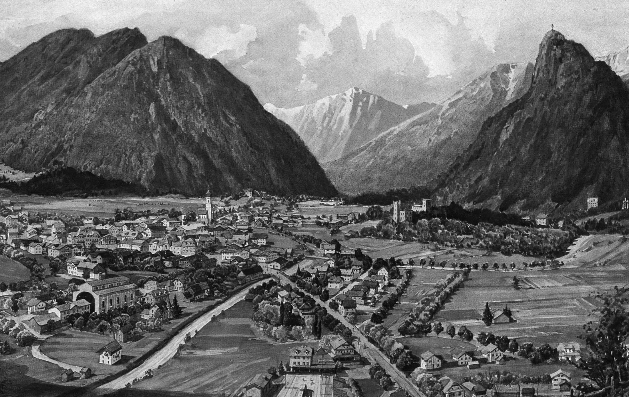 Opposite the northwest door of the parish church was the church farm, belonging to the »Kirchbauer«; it was once known as »Beim Ave-Bauern«, because it was the owner’s responsibility to ring the Ave Maria bell early in the morning and when dusk fell. Up until 1820, the Ammergau Passion Plays took place in the old graveyard located between the parish church and this farm. The stage, called a »playing platform«, leaned against the north wall of the church and the audience sat or stood around it in the free area between the farmhouse and the church.